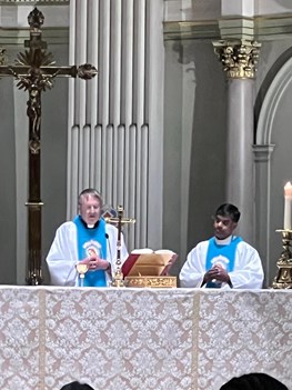 L'abbé Alain Vaillancourt et le Père Arul Jayaraj, csc. ont procédé à la remise de la Flamme d'Amour à chaque personne en particulier.